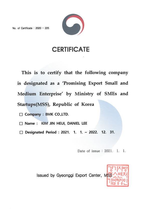 Promising Export Small and Medium Enterprise 페이지 정보 작성자 비엠케이 작성일21-01-22 10:56 조회2,706회 관련링크 이전글 다음글 목록 본문 'Promising Export Small and Medium Enterprise' by Ministry of SMEs and Startups(MSS), Republic of Korea 이전글 다음글 목록